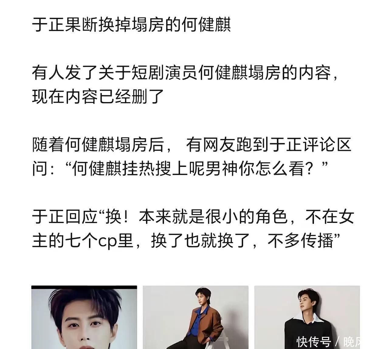 面对风波,于正的反应堪称“冷血又理智”,尽显内娱资本的现实。他不仅立马官宣换角,还在评论区轻描淡写甩锅,直言“本来就是很小的小角色,有一丁点风险都换了”,光速与何健麒切割,半点情面都不留。彼时的何健麒,看似被彻底打入谷底。